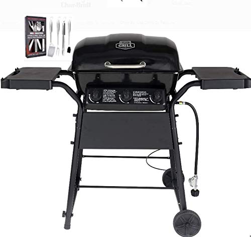 BACKYARD MASTERS Expert Grill 3 Burner 30,000 BTU Gas Grill with Side Shelves, Black with SS Heavy Duty 4 Piece Grill Set