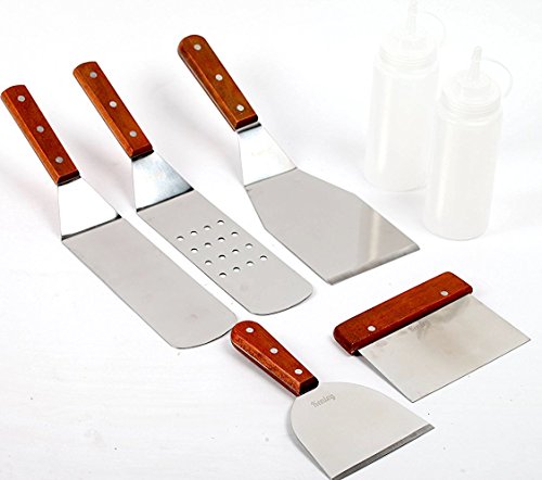 • ALL YOU NEED The 7 tools in this Kenley Griddle Spatula Set provide everything you need for a home or commercial grill set up. The stainless steel tool set includes 2 large restaurant-style spatulas (1 solid long; 1 perforated); a grill scraper; a burger flipper; a chopper; and also two 16oz squirt bottles.
