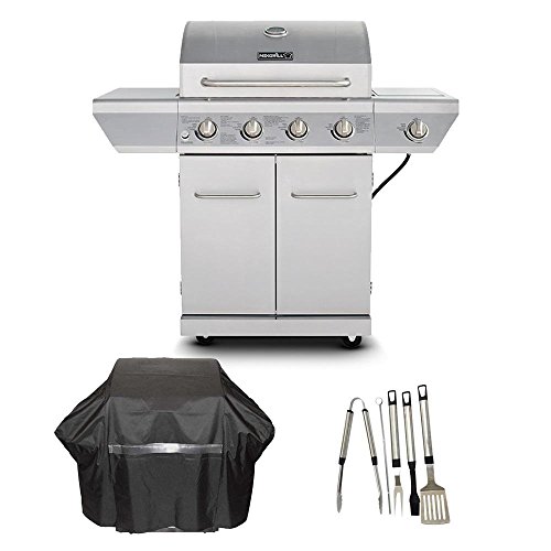 Nexgrill 4-Burner Propane Gas Grill in Stainless Steel with Side Burner and Stainless Steel Doors Plus Cover and Tool Set